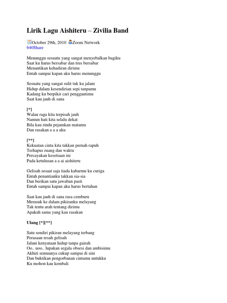 Lirik lagu kunci gitar chord zivilia aishiteru menunggumu intro a e fm e a a e menunggu sesuatu yang sangat menyebalkan bagiku fm saat ku harus bersabar dan trus bersabar cm menantikan kehadiran dirimu a entah sampai kapan aku harus menunggu e sesuatu yang sangat sulit tuk kujalani fm hidup dalam kesendirian sepi tanpamu e kadang ku berpikir cari penggantimu a saat kau jauh. Lirik zivilia aishiteru menunggu lirik menunggu sesuatu yang sangat menyebalkan bagiku saat ku harus bersabar dan trus bersabar menantikan kehadiran dirimu entah sampai kapan aku harus menunggu. Chord zivilia setia intro g d c am d g d c hari berganti bulan g d c bulan berganti tahun g d c waktu demi waktu berlalu cm am namun kau tak pernah berubah d g seperti saat pertama kita bertemu chorus g c d em masih ingatkah saat pertama ku kecup keningmu g am d g c g terucap janji sehidup semati kita bersama g d c bersama dalam suka dan duka g d c bersama dalam tangis dan tawa g d c.